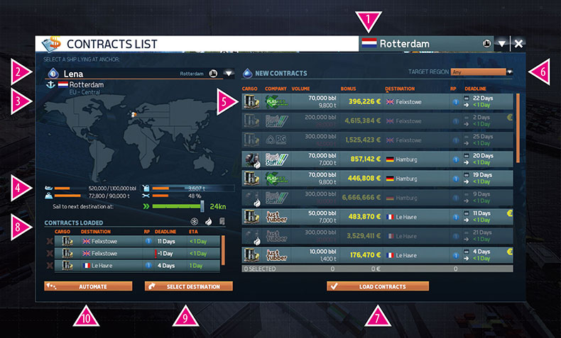 What would a business simulator be without detailed statistics? TransOcean2: Rivals offers you 3 different menus for monitoring your success and keeping an eye on your rivals’ progress. All the statistics menus are located at the bottom left, next to the Contracts List.Ship Report