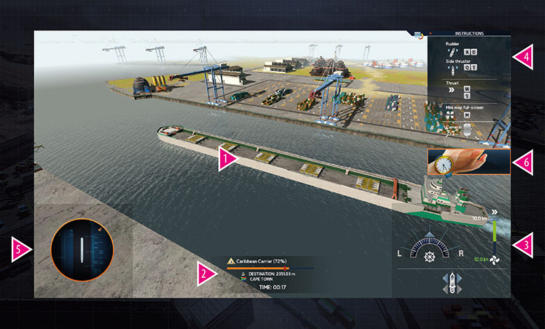 All Single Player modes allow you to control your ships yourself. If the option is activated, Tugboat Companies around the world will occasionally put down their tools and strike. You then have the choice of waiting out the strike or taking control of your ship yourself and guiding it into port.If you choose to take the rudder yourself, the game view switches to a 3D port scene. You can now steer your ship with either the mouse or the keyboard. You can change the camera perspective by holding down the left mouse button and using the mouse wheel. You will always see your target on the minimap. You can zoom in on this by pressing M for a better overview. You now simply have to guide your ship through the port. Please remember that when docking your ship, it must be at a standstill in the highlighted area for it to be able to dock. You can leave the port by sailing at full speed through the displayed target.